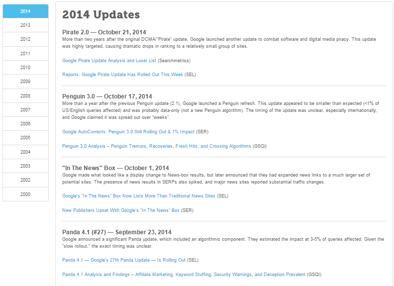 This timeline also makes it easy to look up changes by date. Want to get really fancy? Go to your analytics profile and make an annotation for each of these updates and then sort the data by the largest range of time you can to see if your site had traffic impacts from specific updates. If you know what you have been hit with, you know what you need to fix, and knowing is half the battle my friends. Or something like that.