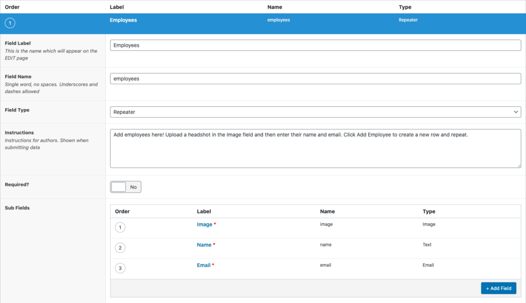 If you use ACF, working with Timber is an absolute dream. Let's say we have a page with a Repeater field that contains an indefinite list of employees: an image, a name and an email.