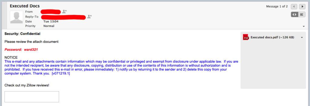 At this point I’m in the closing process and tons of documents are going back and forth between myself, my realtor, the bank, and others (insurance company, etc..). I received an email “from” another realtor agency in my inbox and at first glance nothing appeared to be wrong. It was supposedly from a major, reputable realtor in the area and a PDF was attached, looking like many of the emails that are coming to me.