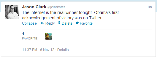 Obama’s first acknowledgement of victory was on Twitter.