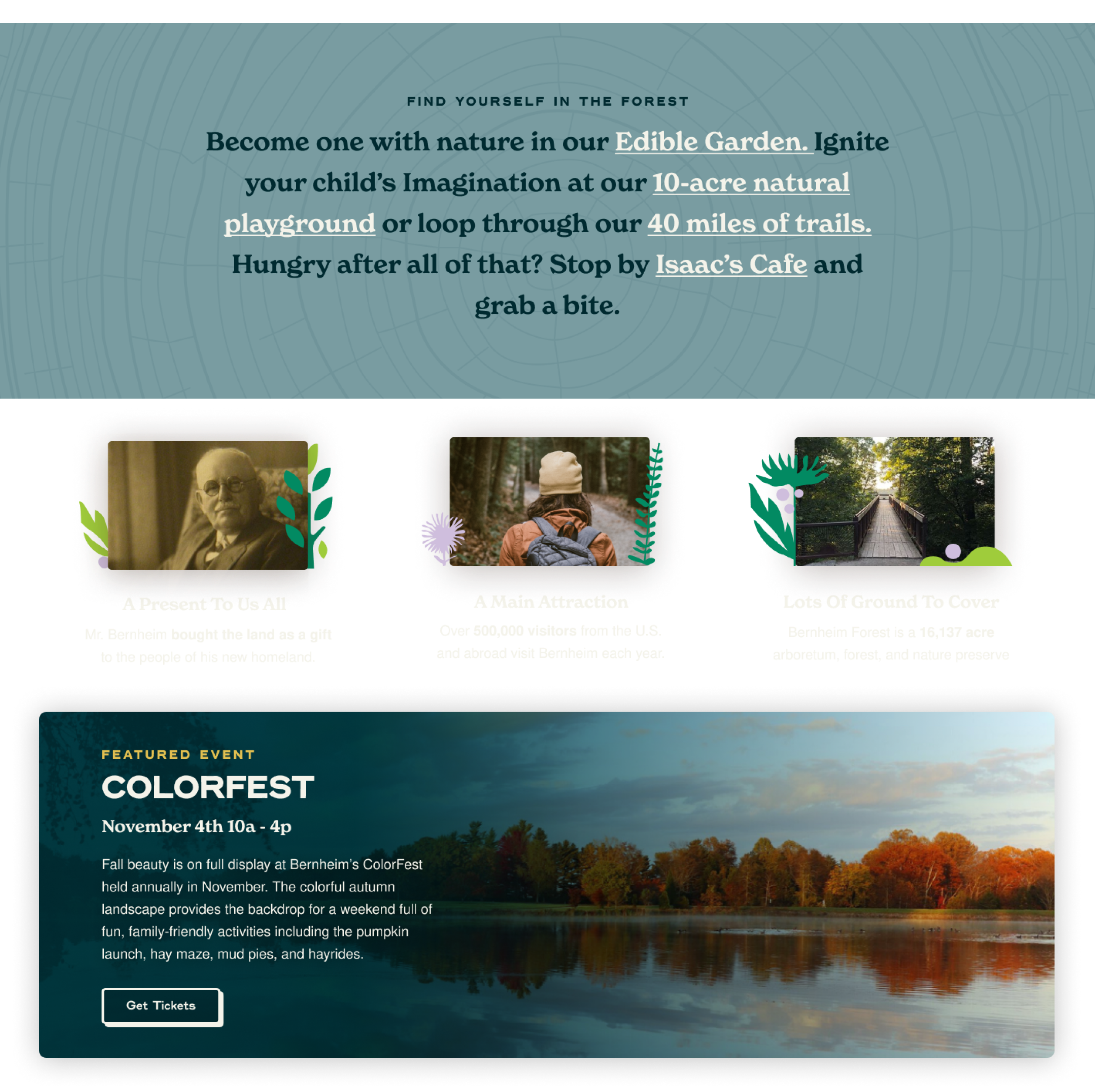 Every design decision considered the updated brand's texture, details, and creativity. Bernheim Forest is an established leader who is to be taken seriously, but that doesn’t mean they don’t have a big personality.