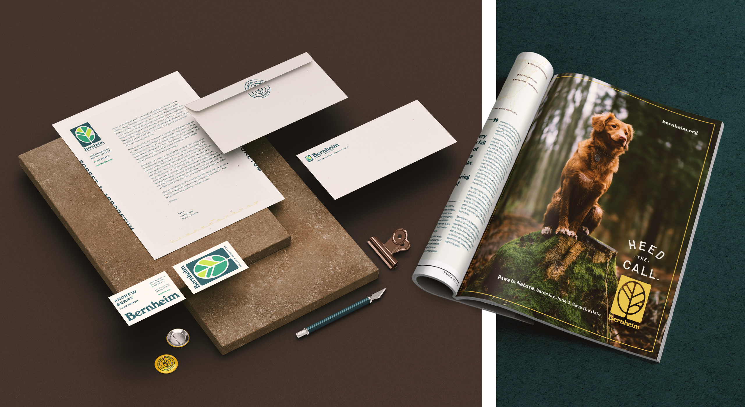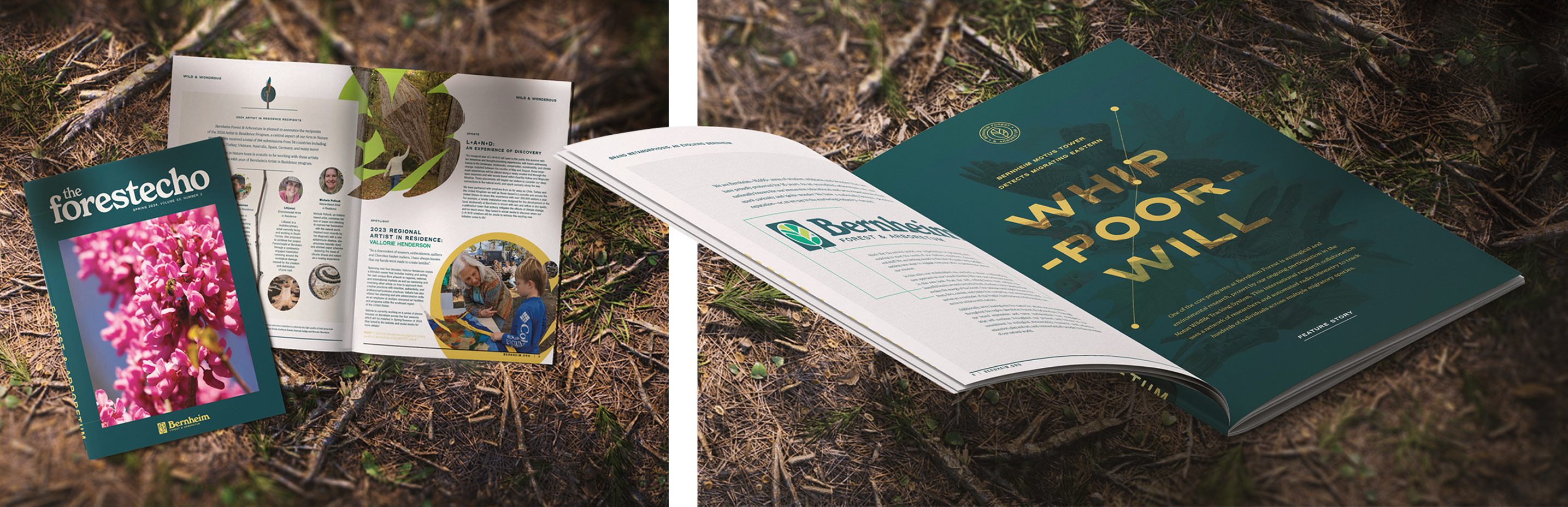 The new brand was launched to coincide with the 95th anniversary of Bernheim and the opening of L+A+N+D, a new and groundbreaking art experience. Included at launch was a new bernheim.org website, Forest Echo magazine, merchandise, and other marketing collateral.