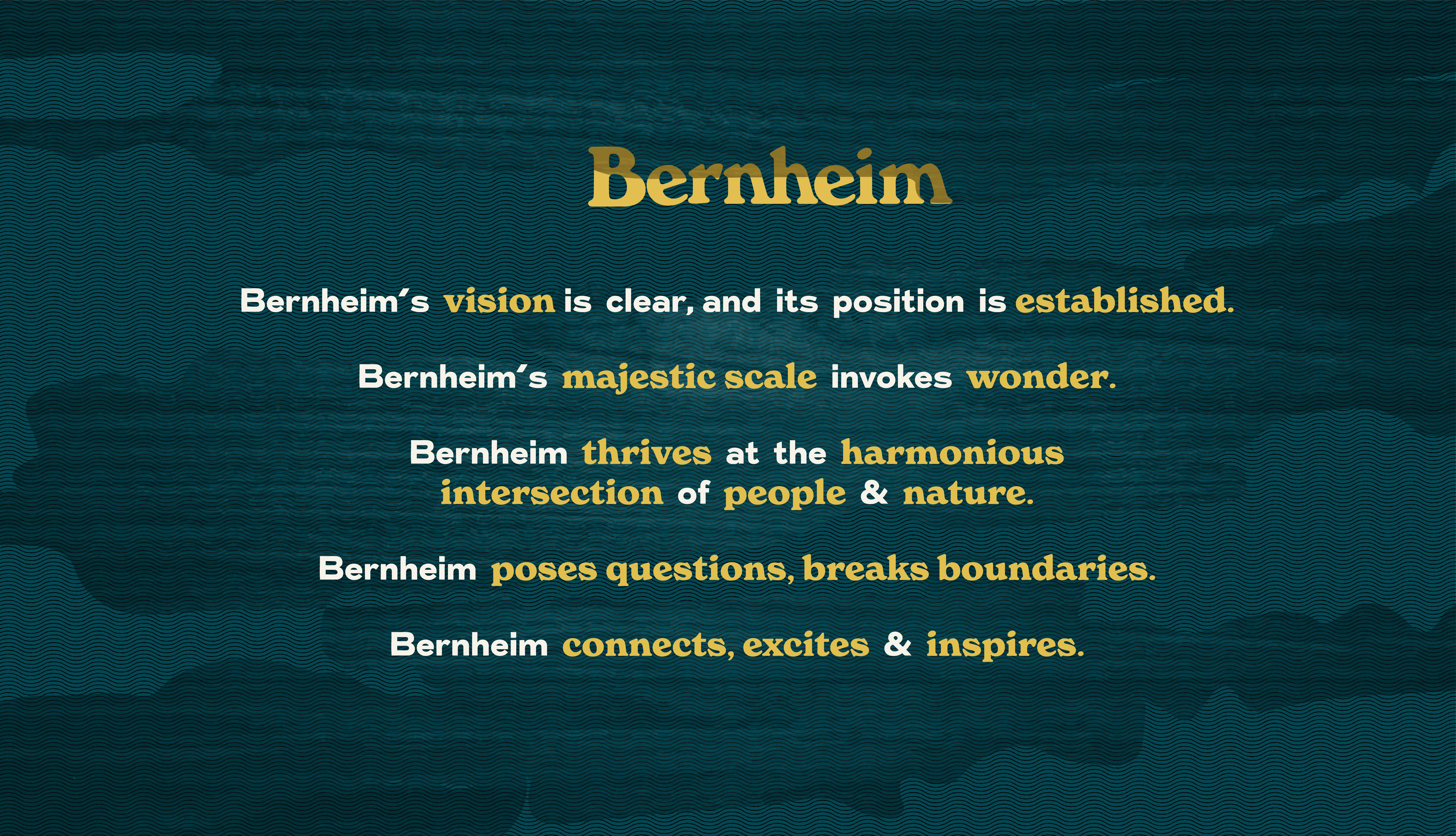 - We give texture to experiences through curious details, and celebrate creativity. We highlight contrasts and celebrate interesting connections. We say it’s fun when it’s fun, boast a bit when we do something unique, but are serious when we need to be. However, we don’t want Bernheim to be a “personality” and we are never snarky, mean or contrarian.