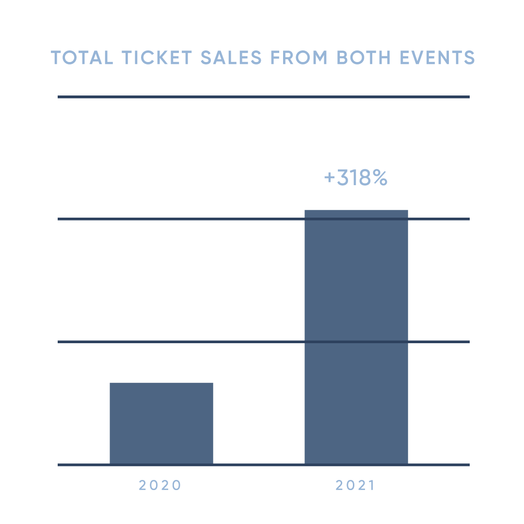 We grew ticket sales across almost all age demographics, with an overall increase of +318% in total ticket sales and +80% increase in out-of-state sales. Video performance on social media was outstanding. We saw hundreds of directly-attributed sales, over 800 shares, and a 15% click-through rate (CTR).